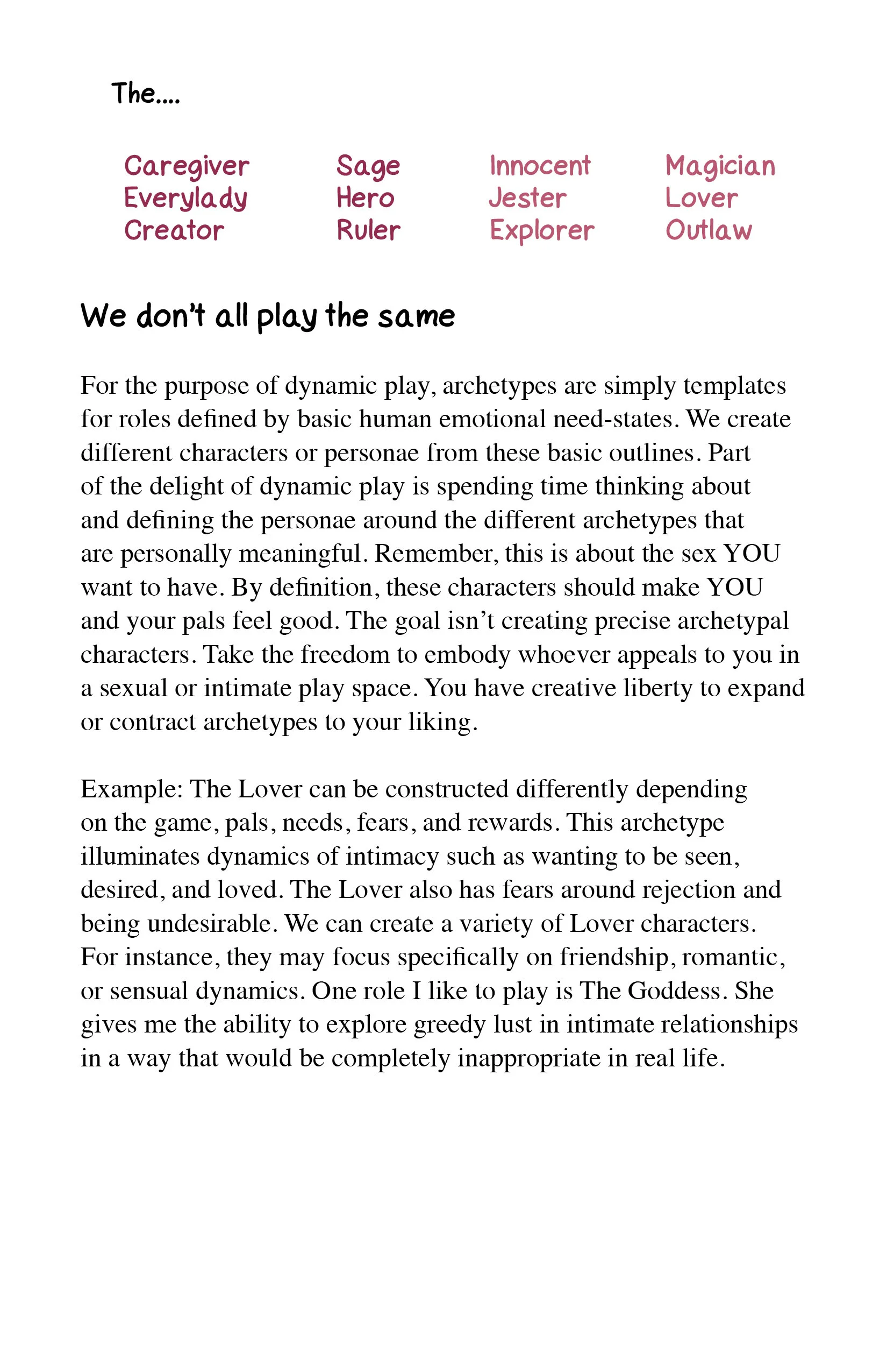 To me, Dynamic Play is essentially Kink Lite™. This model enhances existing sexxxual practices using deliberately scripted roles and games. Dynamic Play teaches character development to meet basic need-states that are otherwise inappropriate or inapplicable to real-life relationship contexts. The goal of the WORKBOOK is to help you discover various sexual characters that inspire you. My pal and I deliberately wrote this to be applicable regardless of how kinky or vanilla your sexxxual preferences are. We both believe that with deliberate power exchanges, we can free up eroticism and make sexxx better!